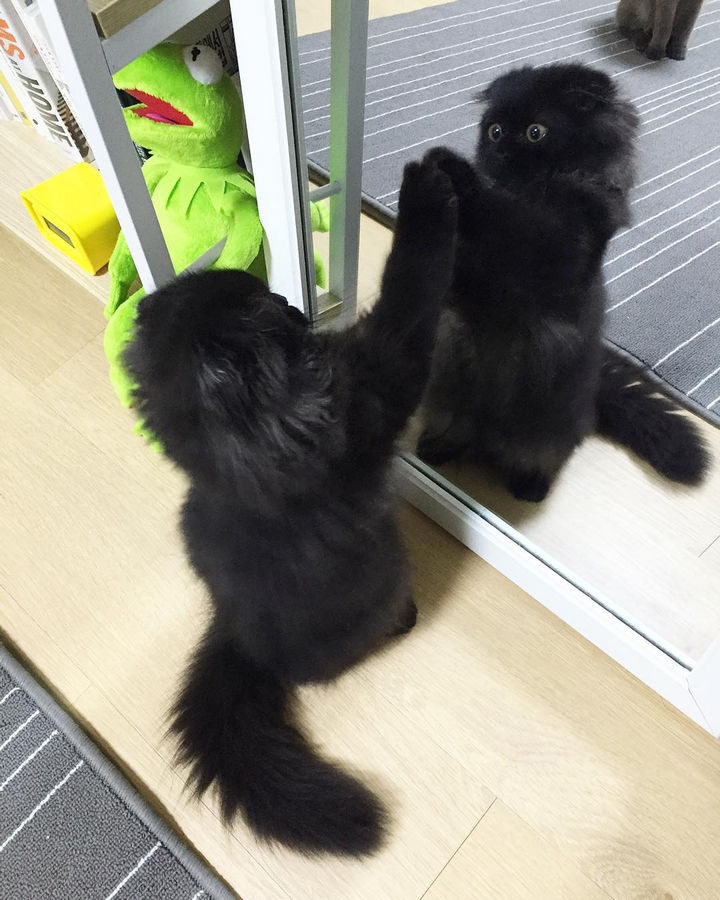 Gimo the cat has a great time with nearly everything does. He knows he is cute and loves admiring himself in the mirror.