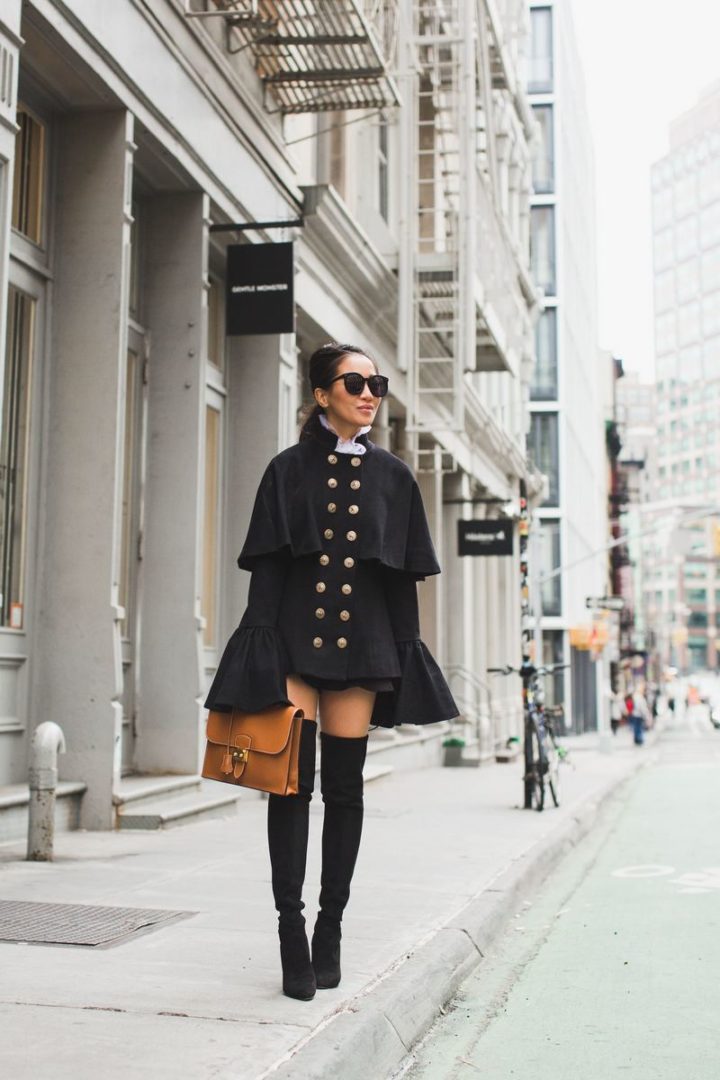 How to Wear: Wear capes like blogger Wendy Nguyen, who has on a pair of knee-high boots and a light brown satchel envelope to complete the outfit. With her messy ponytail and oversized dark sunglasses, her look comes across as both whimsical and enigmatic – sort of like your favorite Bond girl!