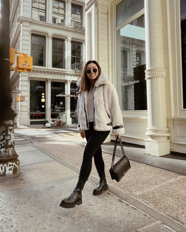 How to Wear: Wear faux fur like New York City-based influencer Alyssa Lenore who paired a light-colored jacket with some dark jeans. Throw on a pair of oversized glasses to complete the mysterious yet refined look.