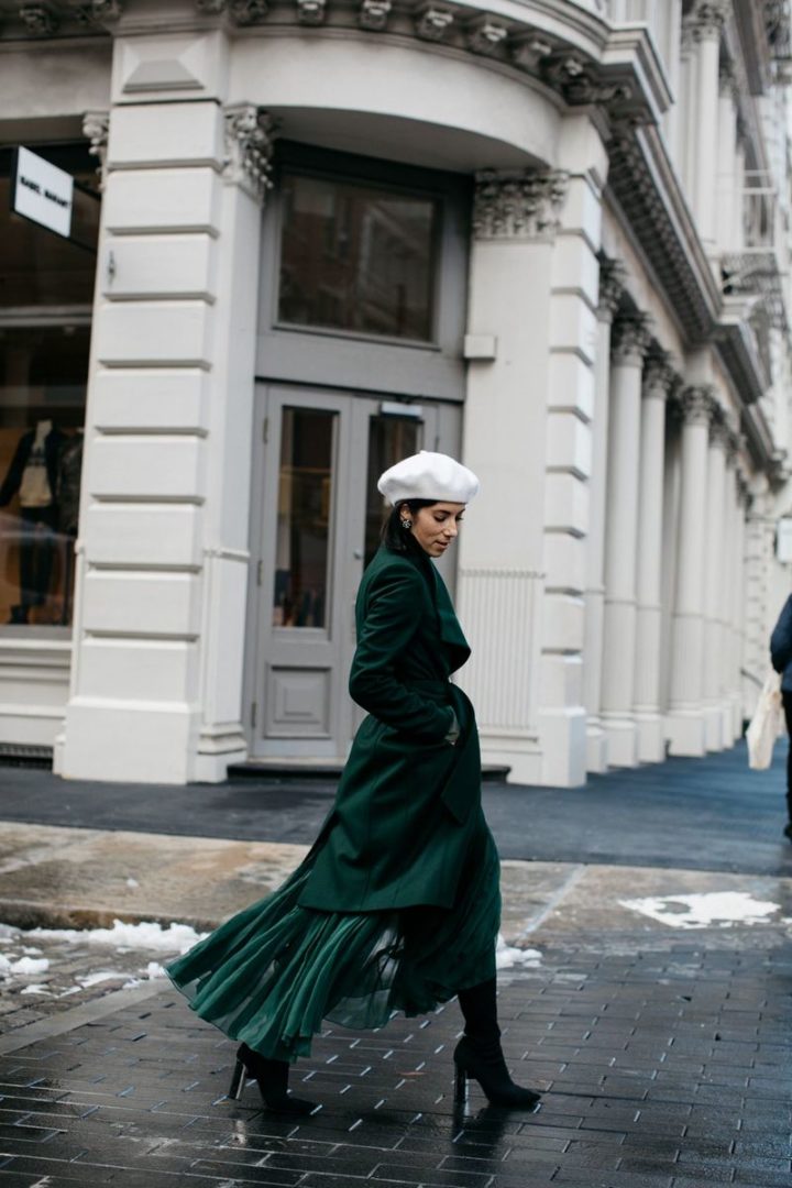 How to Wear: Wear jewel tones like blogger Krystal Blick by using them as a statement piece, layering an emerald coat over the rest of her outfit. Underneath, she has on garments in the same shade range as her outerwear, highlighting the beautiful color even more.