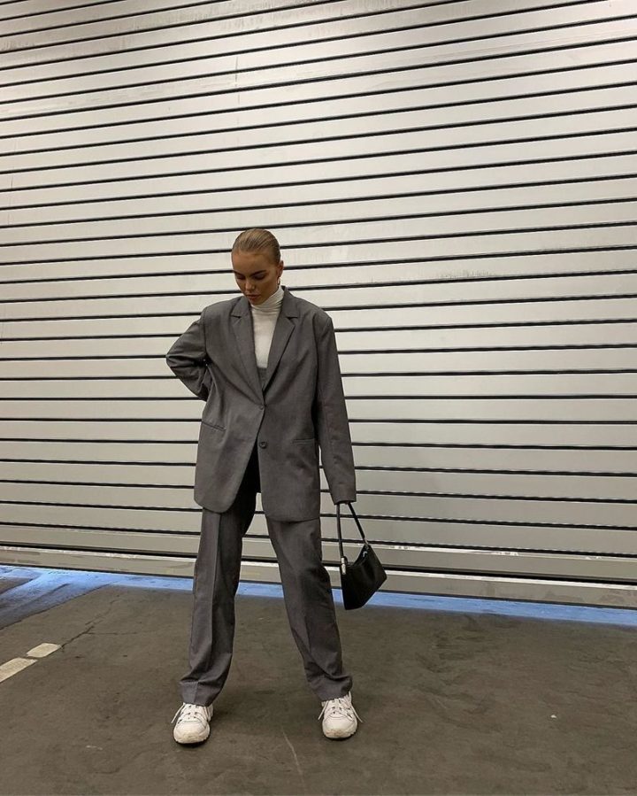 How to Wear: Wear the preppy aesthetic like influencer Ylva Finstad Aasjord, who dons on an oversized suit over a cream-colored turtleneck. With her slicked-back hair, the overall effect is one of classic yet modern sophistication. However, she keeps the look casual and fun with a pair of chunky white sneakers.
