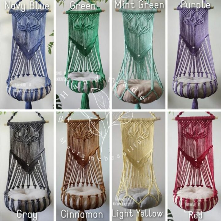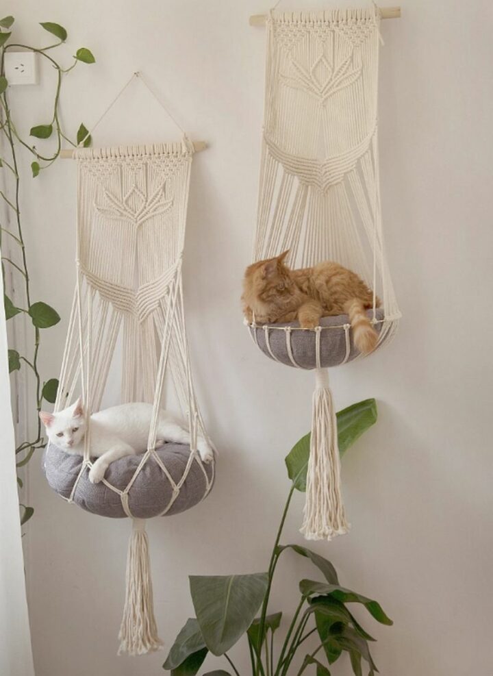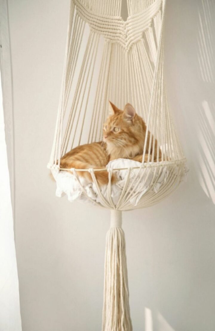 This innovative macrame cat hammock comes in a variety of styles and colors and lets your cat relax in comfort.