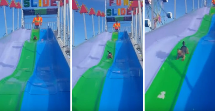 He is having the time of his life and I bet if dogs could talk, he’d be saying, “Again! Again!” Please share this adorable little puppy having fun on a carnival slide with your friends and family.