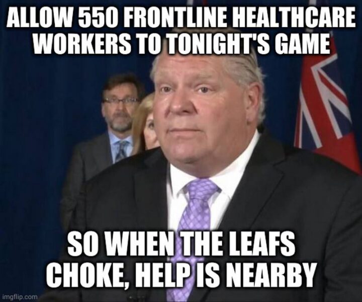 “Allow 550 frontline healthcare workers to tonight’s game so when the Toronto Maple Leafs choke, help is nearby.”
