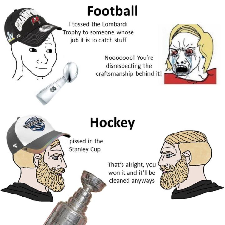 “Football: I tossed the Vince Lombardi Trophy to someone whose job is to catch stuff. No! You’re disrespecting the craftsmanship behind it! Hockey: I pissed in the Stanley Cup. That’s alright, you won it and it’ll be cleaned anyways.”