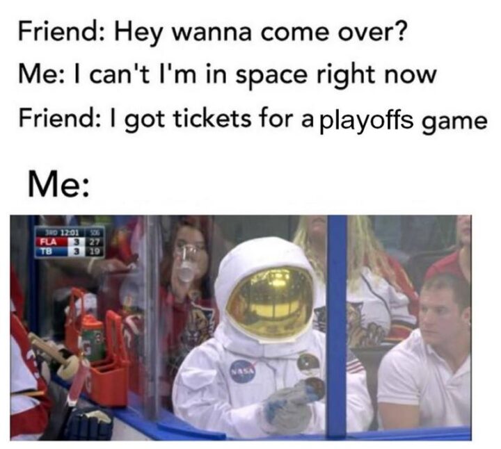 “Friend: Hey, wanna come over? Me: I can’t, I’m in space right now. Friend: I got tickets for a playoffs game. Me:”