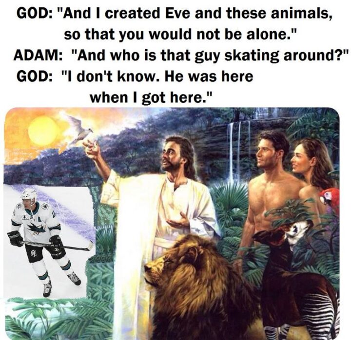 “God: And I created Eve and these animals so that you would not be alone. Adam: And who is that guy skating around? God: I don’t know. He was here when I got here.”