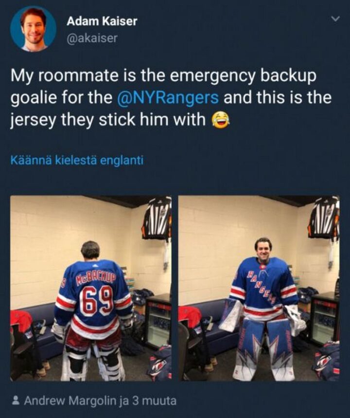 “My roommate is the emergency backup goalie for the New York Rangers and this is the jersey they stick him with.”