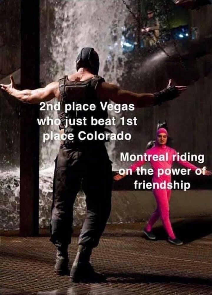 “2nd Place Vegas Golden Knights who just beat 1st place Colorado Avalanche. Montreal Canadiens riding on the power of friendship.”