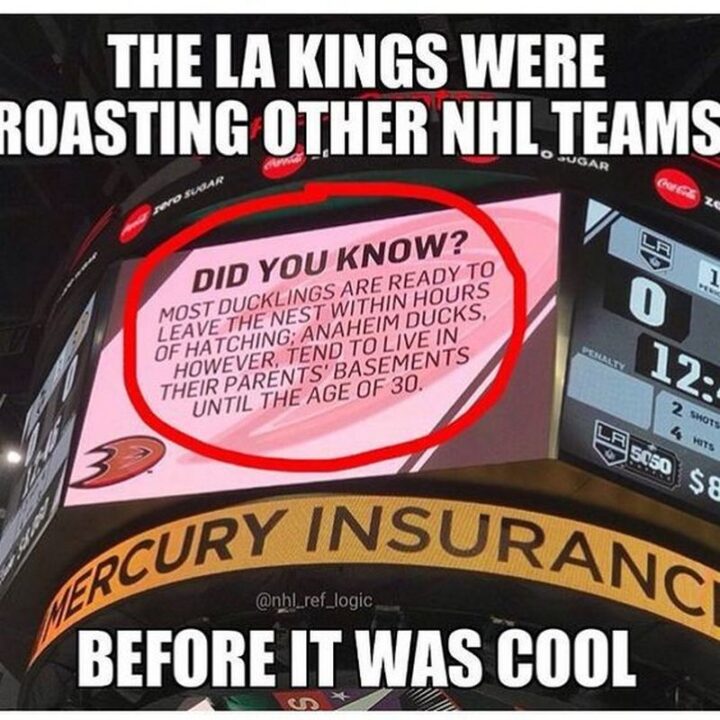 “The Los Angeles Kings were roasting other NHL teams before it was cool. Did you know? Most ducklings are ready to leave the nest within hours of hatching; Anaheim Ducks, however, tend to live in their parent’s basements until the age of 30.”