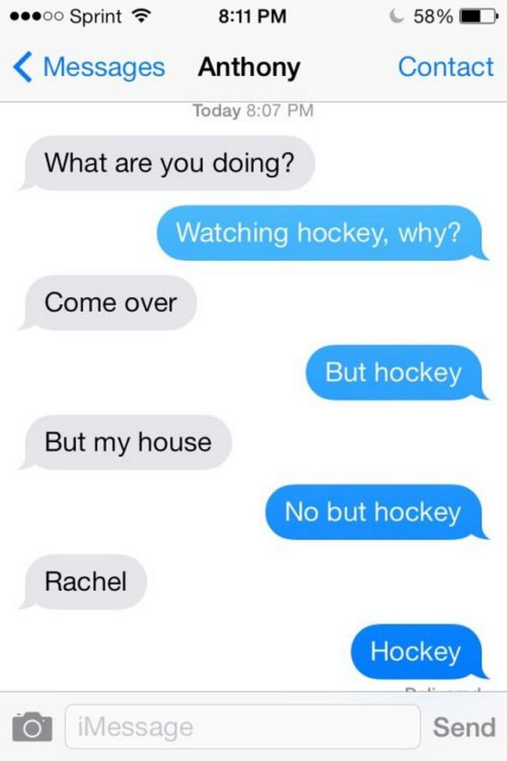 “What are you doing? Watching hockey, why? Come over. But hockey. But my house. No, but hockey. Rachel. Hockey.”