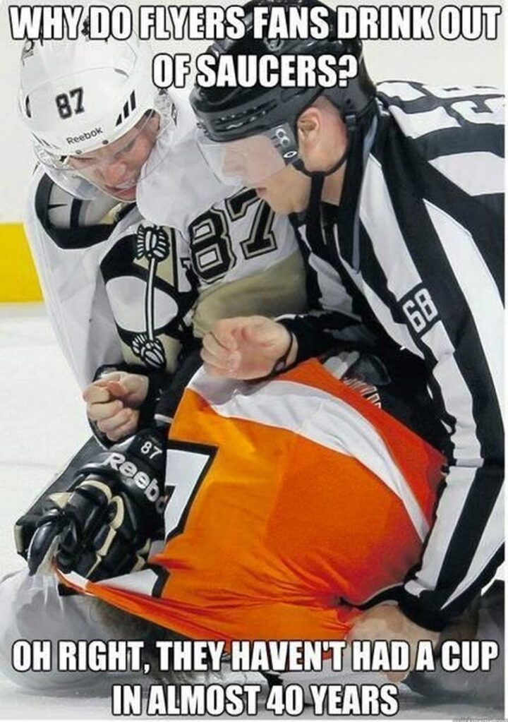 “Why do Philadelphia Flyers fans drink out of saucers? Oh right, they haven’t had the Stanley Cup in almost 40 years.”