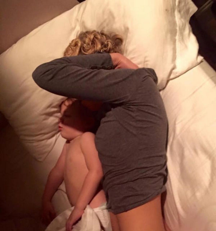 Bobby Wesson from Gardendale, Alabama, shared a photo of his wife, Rayena, sleeping with their son before she gets ready to go to work.