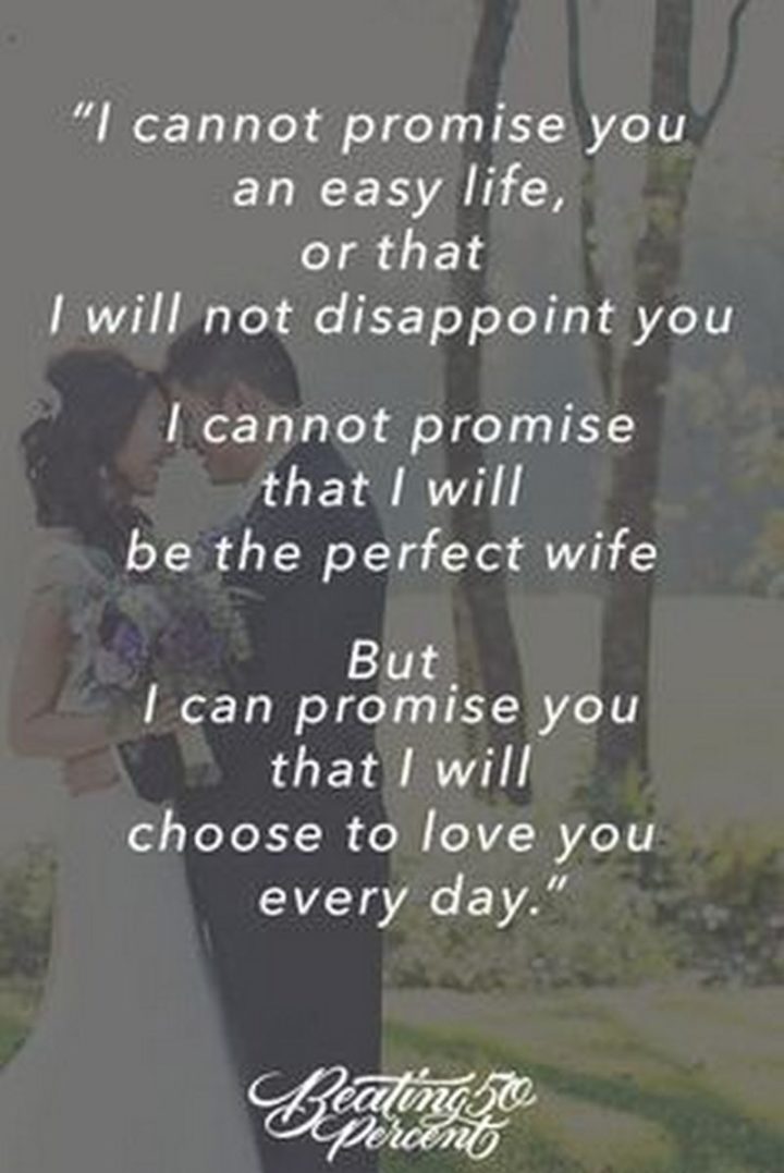 “I cannot promise you an easy life, or that I will not disappoint you. I cannot promise that I will be the perfect wife. But I can promise you that I will choose to love you every day.” – Unknown