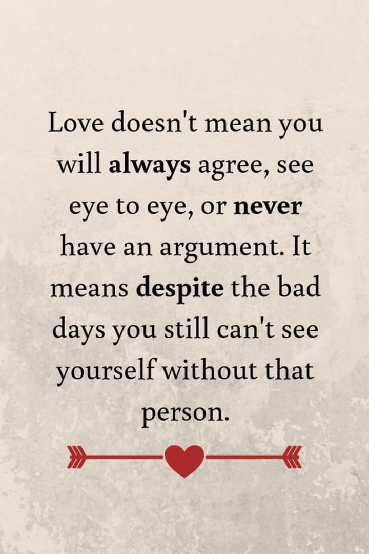 “Love doesn’t mean you will always agree, see eye to eye, or never have an argument. It means despite the bad days you still can’t see yourself without that person.” – Unknown