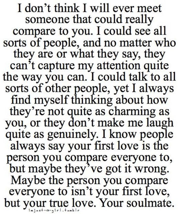“I don’t think I will ever meet someone that could really compare to you. I could see all sorts of people, and no matter who they are or what they say, they can’t capture my attention quite the way you can. I could talk to all sorts of other people, yet I always find myself thinking about how they’re not quite as charming as you, or they don’t make me laugh quite as genuinely. I know people always say your first love is the person you compare everyone to, but maybe they’ve got it wrong. Maybe the person you compare everyone to isn’t your first love, but your true love. Your soulmate.” – Unknown