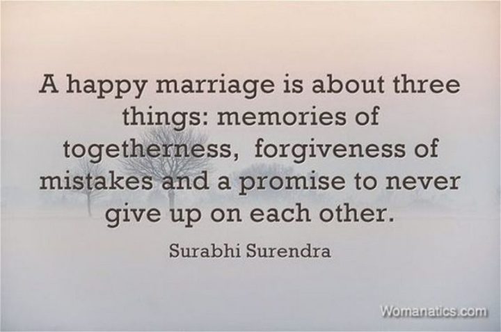 “A happy marriage is about three things: Memories of togetherness, the forgiveness of mistakes, and a promise to never give up on each other.” – Unknown