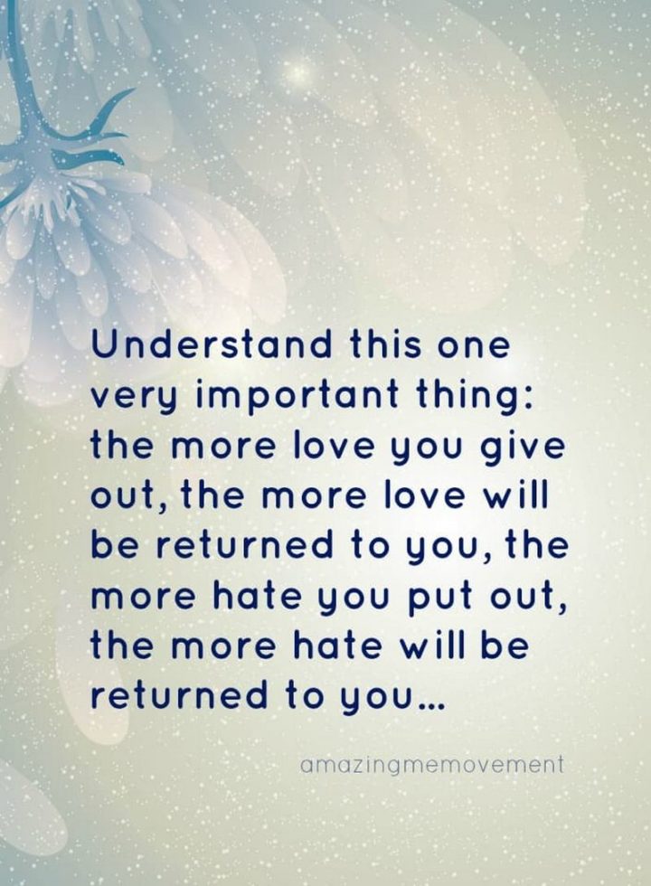 “Understand this one very important thing: The more love you give out, the more love will be returned to you, the more hate you put out, the more hate will be returned to you…” – Unknown