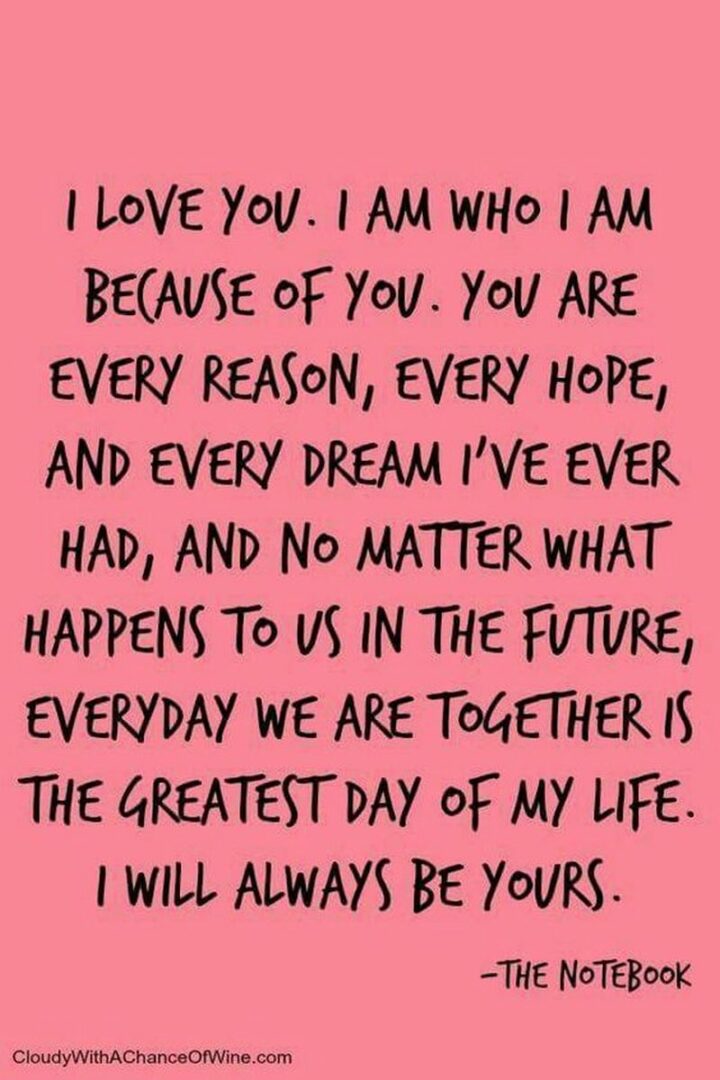 2) “I love you. I am who I am because of you. You are every reason, every hope, and every dream I’ve ever had, and no matter what happens to us in the future, every day we are together is the greatest day of my life. I will always be yours.” – The Notebook