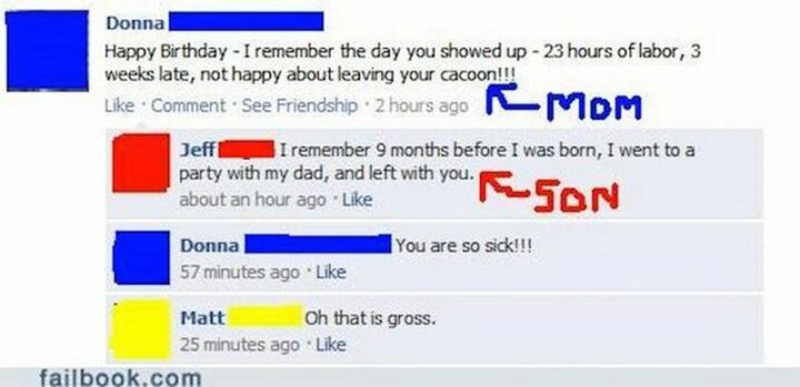 “Mom: Happy birthday. I remember the day you showed up. 23 hours of labor, 3 weeks later, not happy leaving your cocoon!!! Son: I remember 9 months before I was born, I went to a party with my dad, and left with you. Mom: You are so sick!!! Matt: Oh, that is gross.”