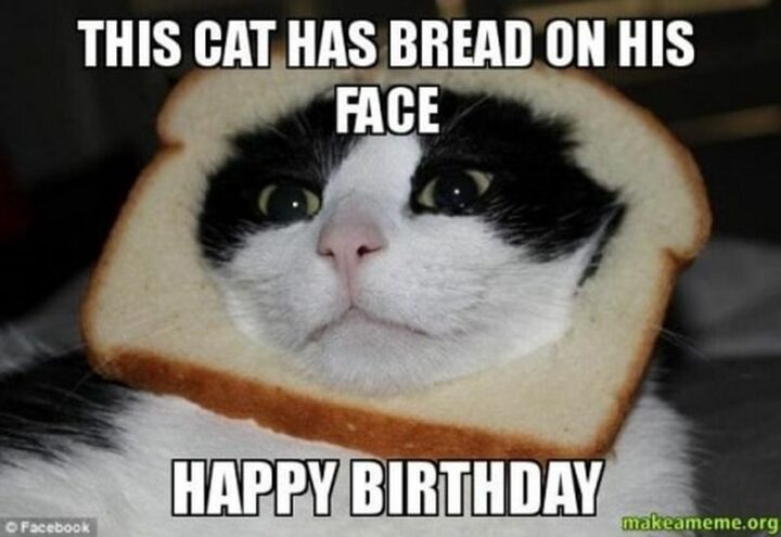 “This cat has bread on his face. Happy birthday.”