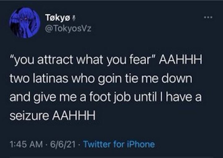 “‘You attract what you fear’ AAHHH two Latinas who going tie me down and give me a foot job until I have a seizure AAHHH.”