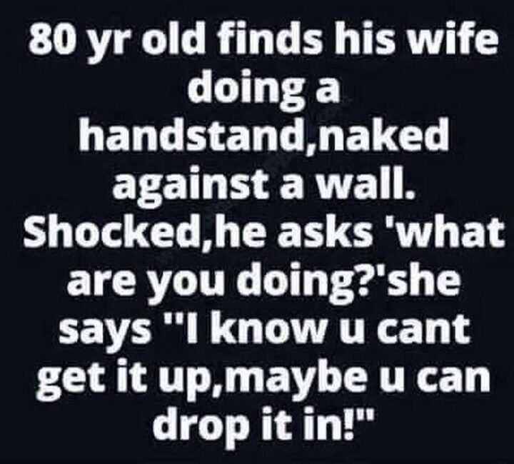 “80 year old finds his wife doing a handstand, naked against a wall. Shocked, he asks ‘What are you doing?’ She says ‘I know u can’t get it up, maybe u can drop it in!'”