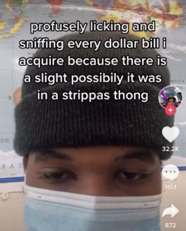“Profusely licking and sniffing every dollar bill I acquire because there is a slight possibility it was in a stripper’s thong.”