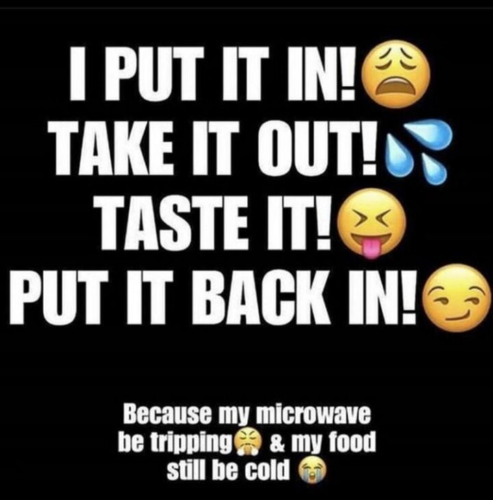 “I put it in! Take it out! Taste it! Put it back in! Because my microwave be tripping and my food still be cold.”