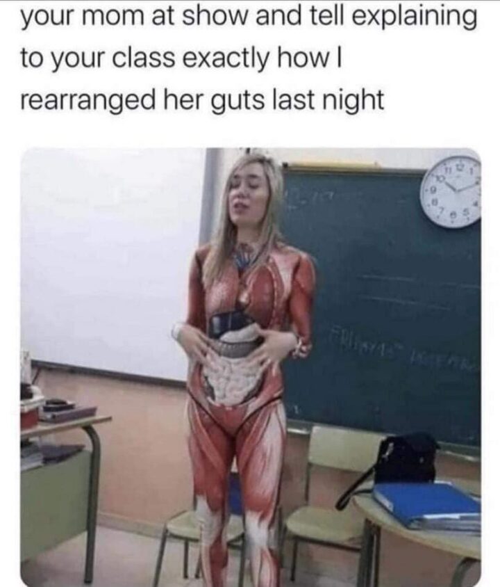 “Your mom at show and tell explaining to your class how I rearranged her guts last night.”