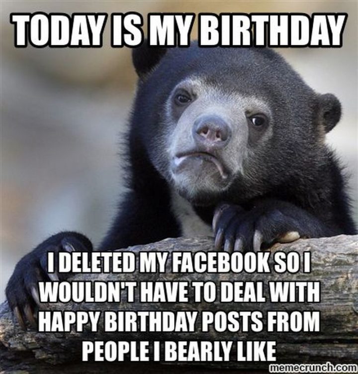 “Today is my birthday. I deleted my Facebook so I wouldn’t have to deal with Happy Birthday posts from people I bearly like.”