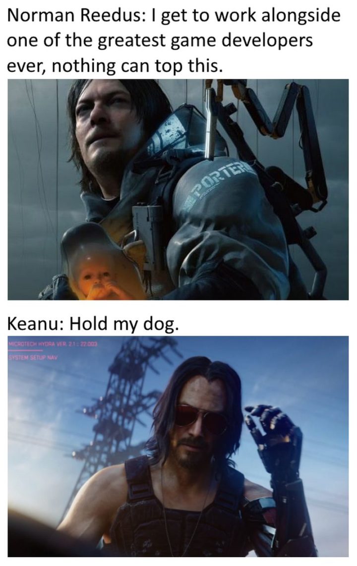 “Norman Reedus: I get to work alongside one of the greatest game developers ever, nothing can top this. Keanu: Hold my dog.”