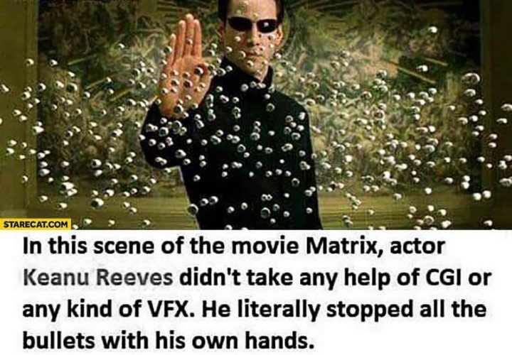 “In this scene of the movie Matrix, actor Keanu Reeves didn’t take any help of CGI or any kind of VFX. He literally stopped all the bullets with his own hands.”