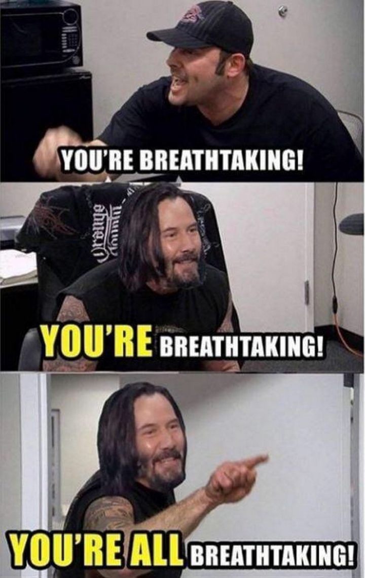 Keanu Reeves is no stranger to memes and is on everything from ‘Bill & Ted’s Excellent Adventure’ memes to Matrix memes, and now to breathtaking memes. The latter because of a fan screaming out, “You’re breathtaking” to Keanu and Keanu screaming back, “No, you’re breathtaking!”. We scoured the web for the best memes and here are 57 memes that are simply breathtaking.