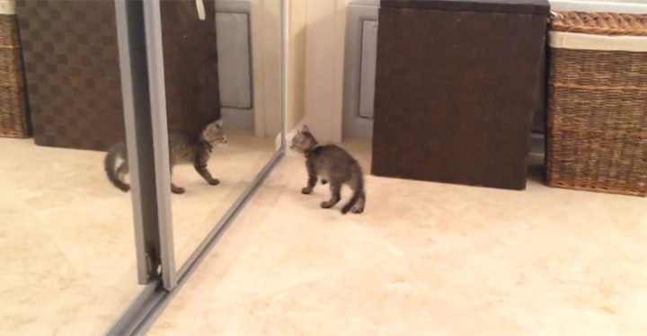 A kitten discovered his reflection in a mirror for the first time and he went into attack mode! He lunges and makes the most adorable attack moves and he doesn’t realize that he is battling with himself.