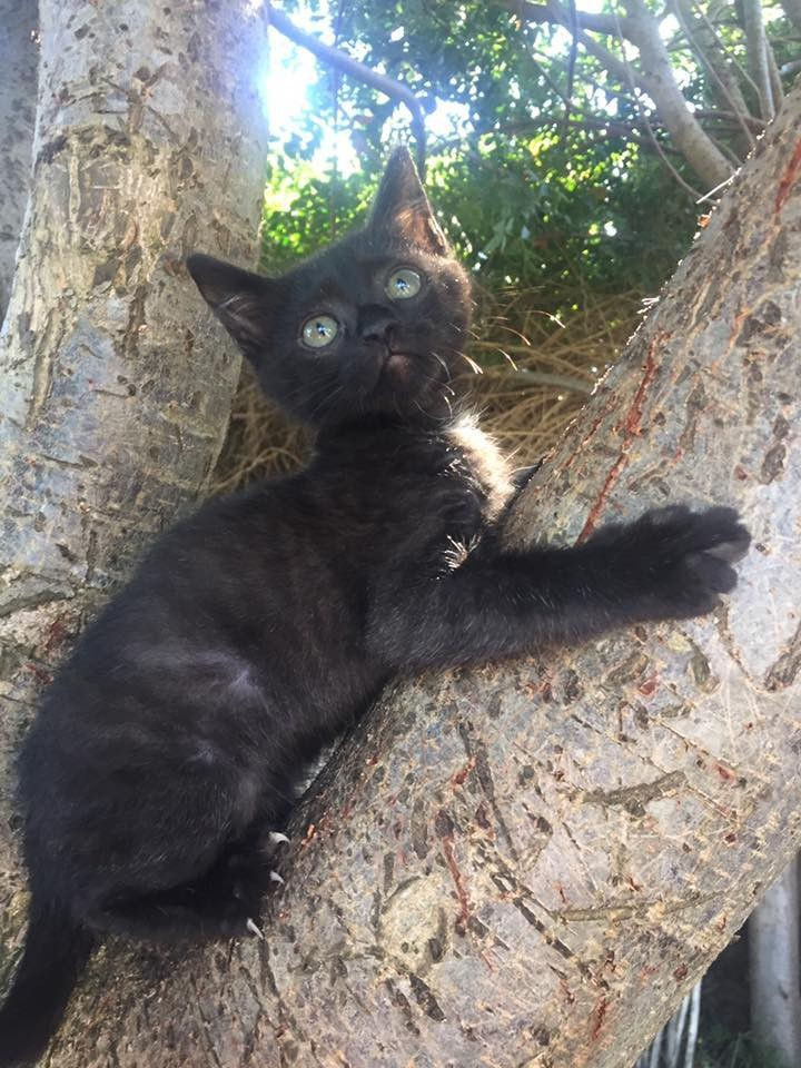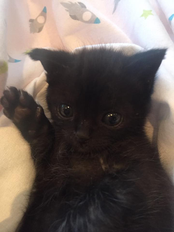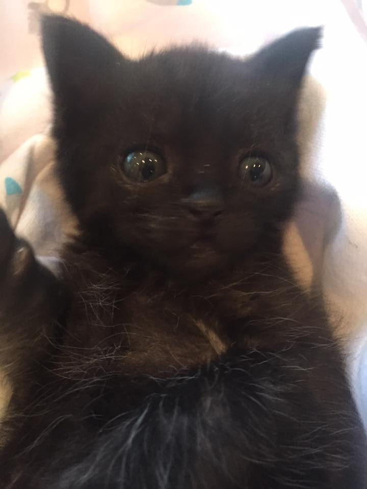 In October, the staff at the African Maritime Services in Cape Town began hearing loud cries coming from the factory. As the sound began to get louder as they searched for the source, they found it came from inside a large cable reel. When they looked inside, they found three kittens. Two had already passed away but the remaining tiny black kitten had a severely injured paw and was clinging to life.