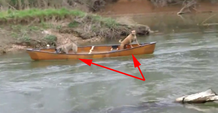 Amazingly, one of the dogs takes a rope he finds in the canoe and places it on the outside of the canoe. This quick-thinking act helps the Labrador provide him with something to bite onto. Once the Labrador grabs the rope, he calmly swims towards shore and saves the day!