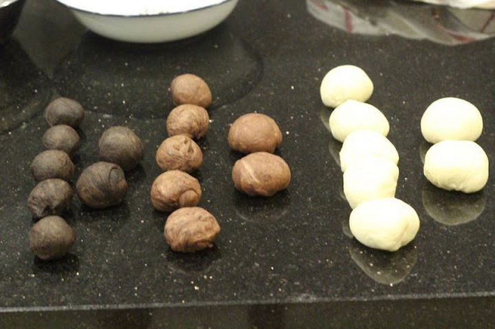 First, she starts with three balls of dough. White, brown, and a darker brown dough.