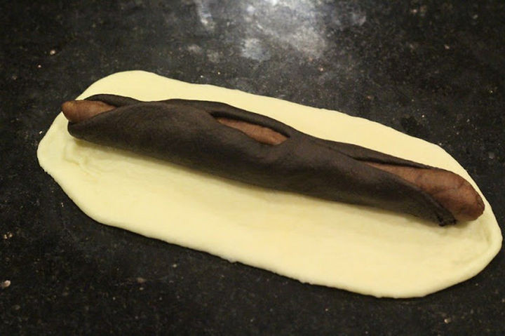 The darker colored dough wraps around the lighter colored dough. Then repeat the process with the white dough.