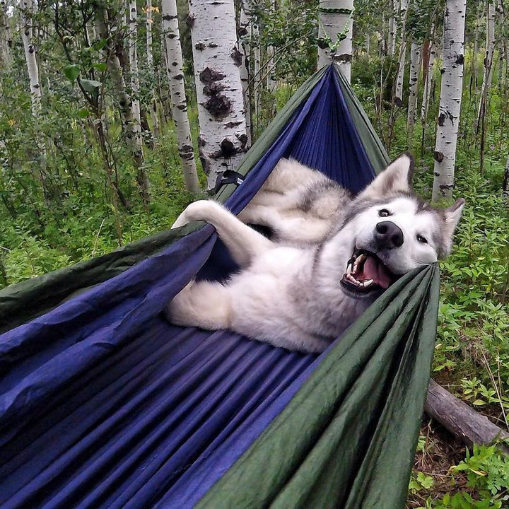 Loki loves camping and after a day of hiking and playing outside, he loves taking a nap.