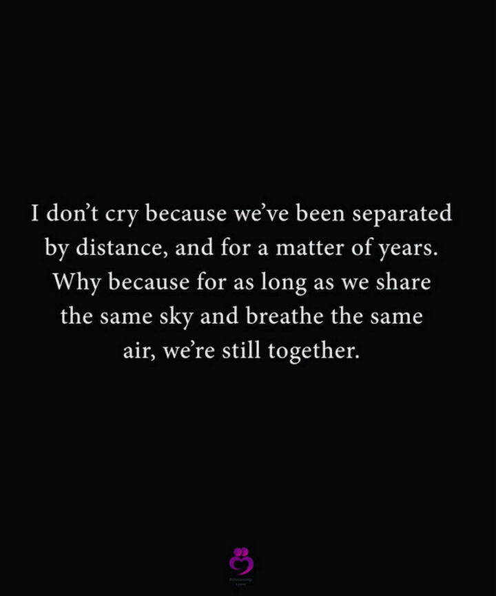 17) “I don’t cry because we’ve been separated by distance, and for a matter of years. Why? Because for as long as we share the same sky and breathe the same air, we’re still together.” – Donna Lynn Hope