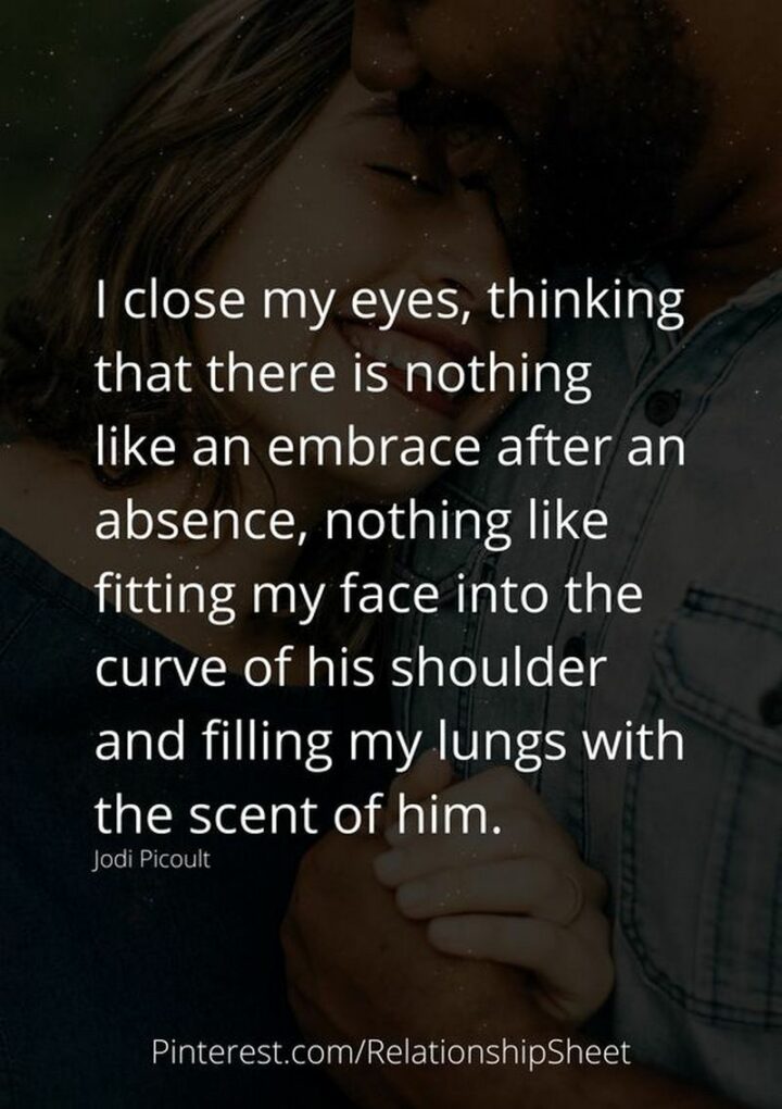 15) “I close my eyes, thinking that there is nothing like an embrace after an absence, nothing like fitting my face into the curve of his shoulder and filling my lungs with the scent of him.” – Jodi Picoult