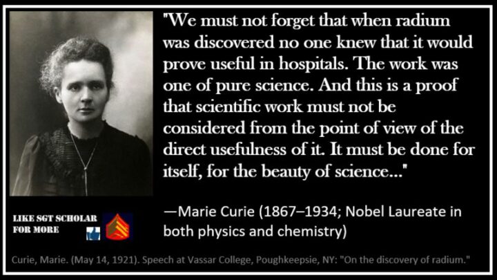 30) “We must not forget that when radium was discovered, no one knew that it would prove useful in hospitals. The work was one of pure science. And this is a proof that scientific work must not be considered from the point of view of the direct usefulness of it. It must be done for itself, for the beauty of science…”