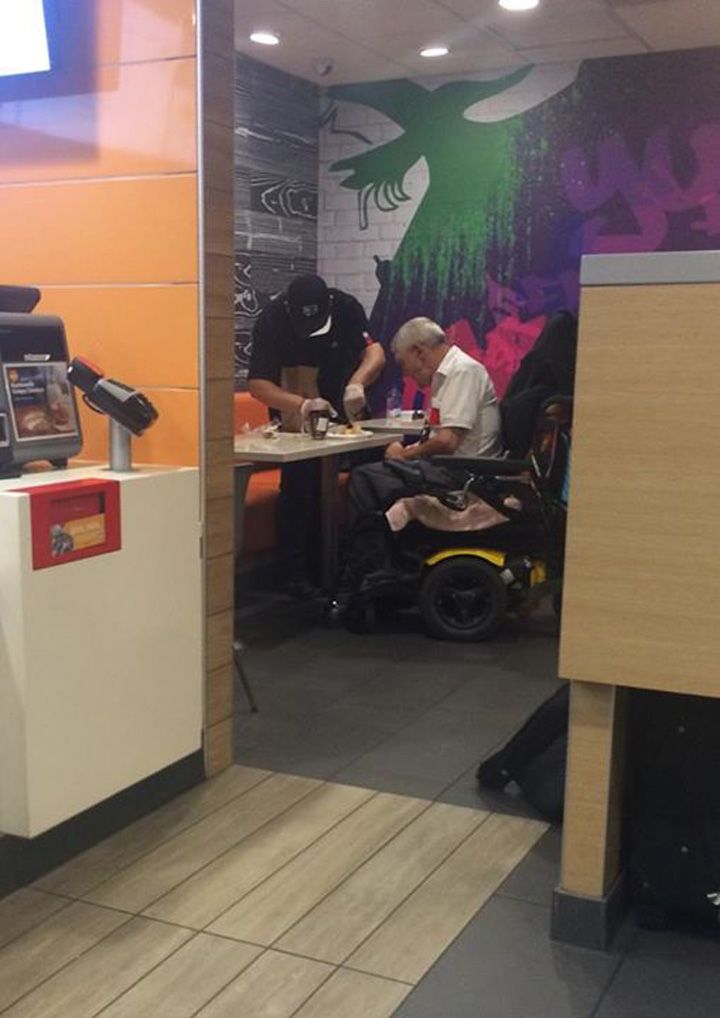 A disabled elderly man approached the counter and asked for help; however, nobody knew what kind of help he was requesting. Seconds after, the McDonald’s worker shut down his register, washed his hands, went over to his table, and proceeded to help the man cut and eat his meal. She posted a photo on Facebook and it has since gone viral and it definitely restores our faith in humanity.