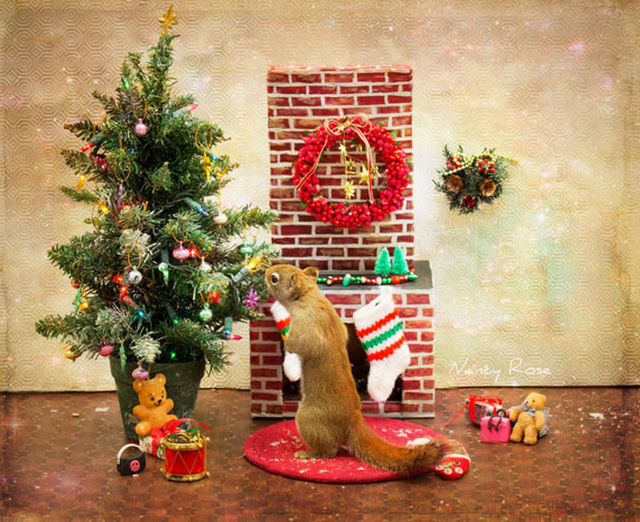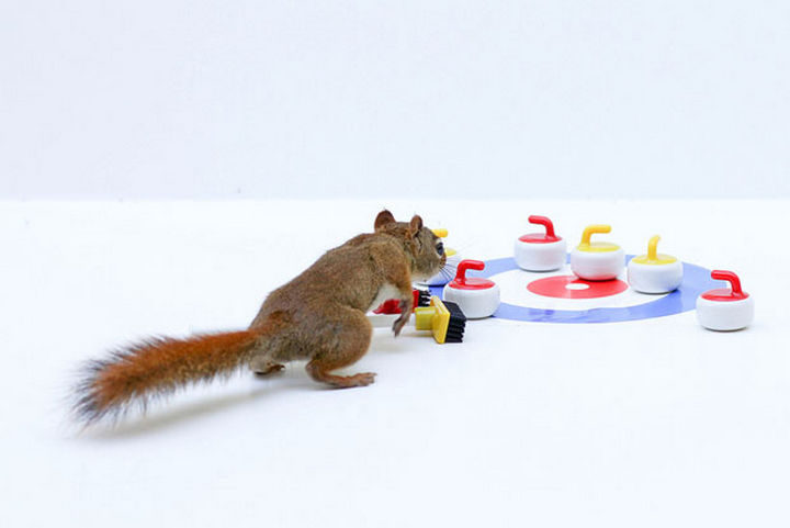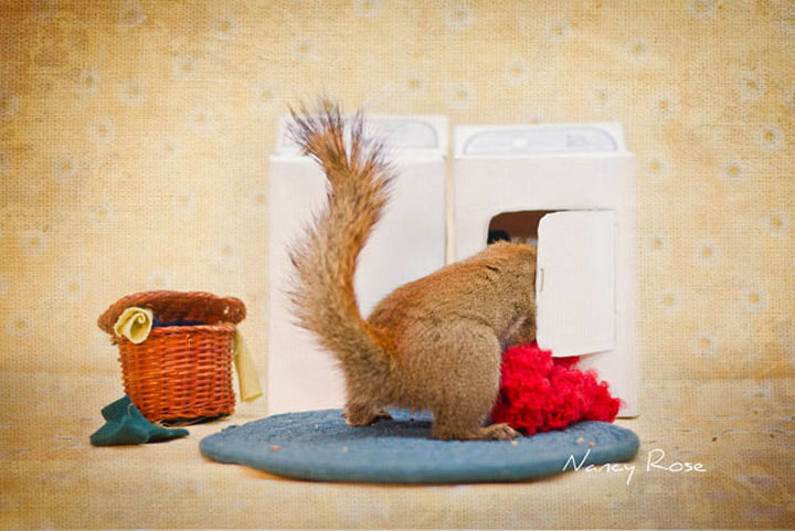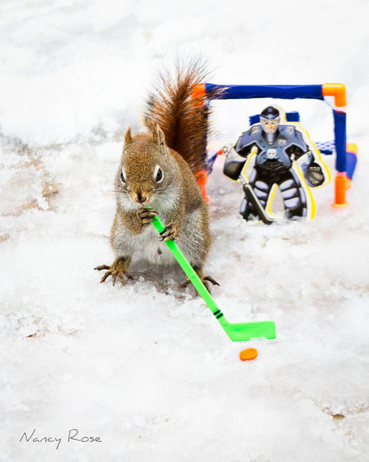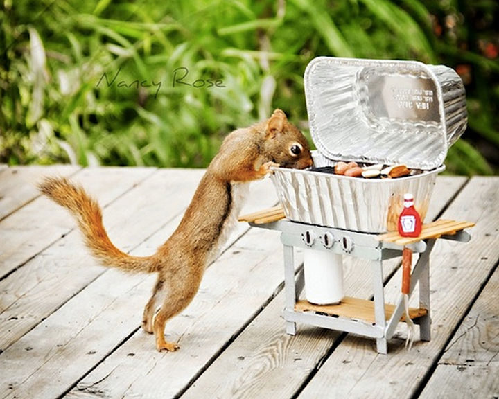 She decided to create various props and scenes and hid peanuts within them. She would lay them down on her deck and wait for the perfect shot and she has captured so many cute and funny shots.
