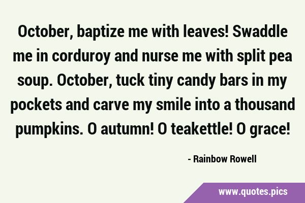 5) “October, baptize me with leaves! Swaddle me in corduroy and nurse me with split pea soup. October, tuck tiny candy bars in my pockets and carve my smile into a thousand pumpkins. O autumn! O teakettle! O grace!” – Rainbow Rowell, Attachments