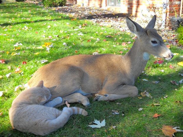Please share this adorable deer visiting a friendly feline every morning with your friends and show them you care. Friends are forever.