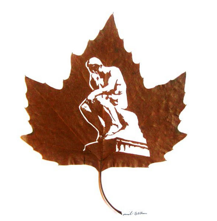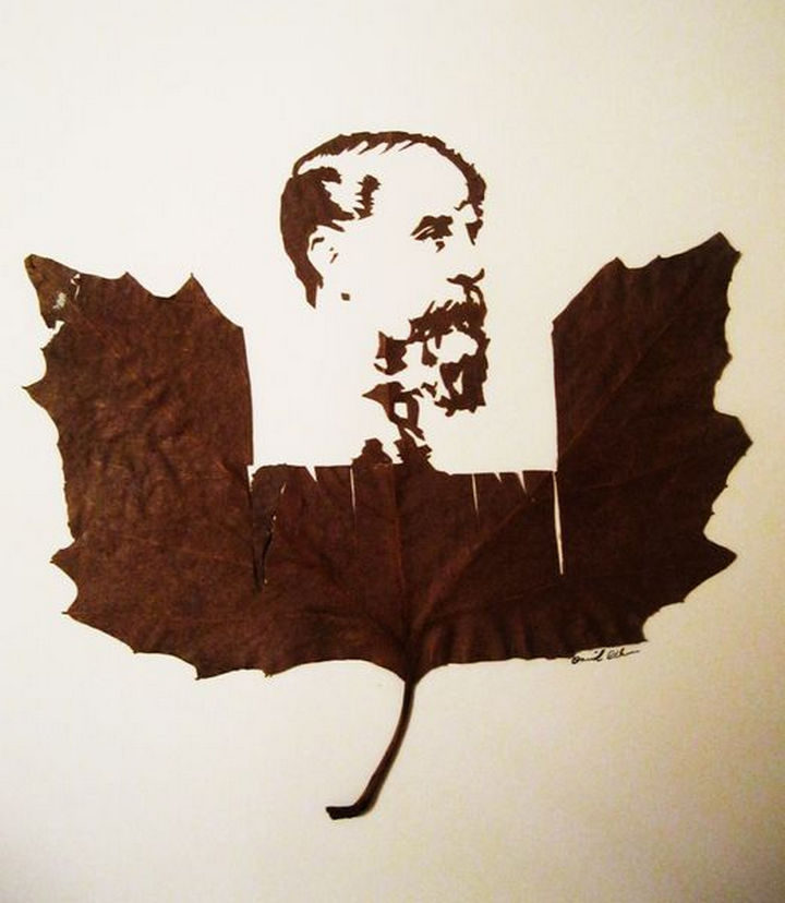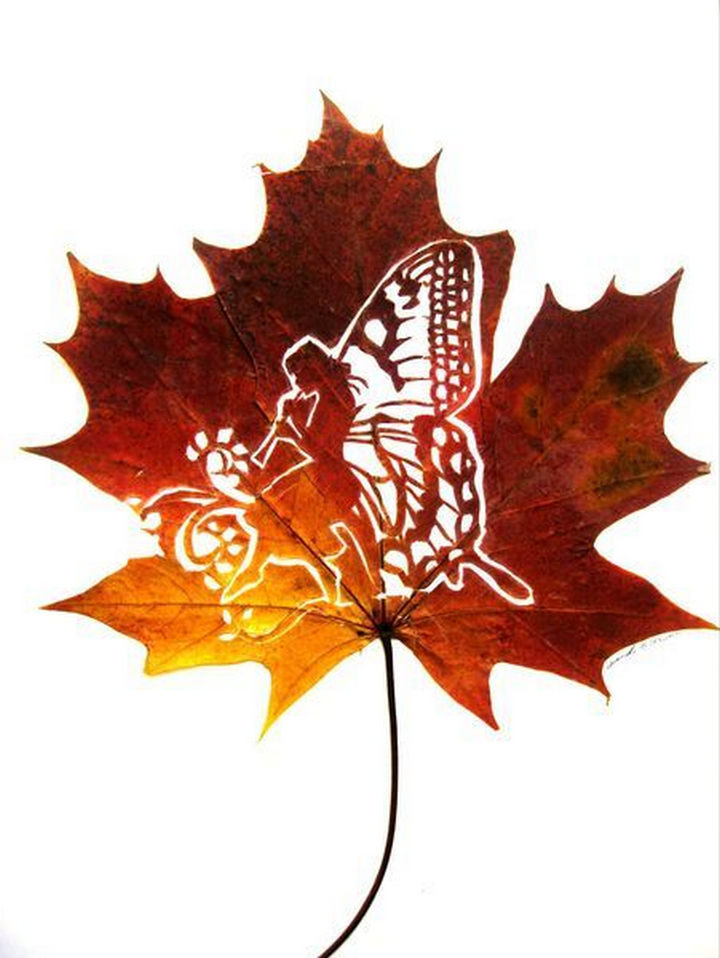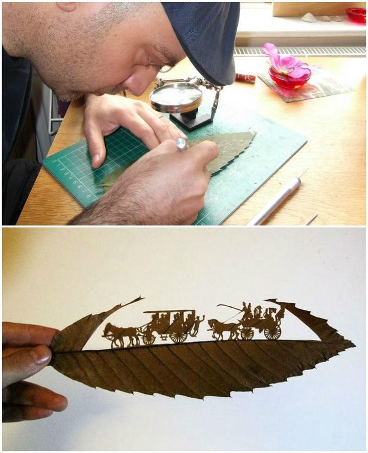 Today, he takes leaf cutting to a whole new level by creating beautiful and intricate leaf art pieces by carving fallen leaves. His work has been on display in London and Italy and he continues to astound art lovers with intricate leaf art carvings that are created with only a scalpel, a magnifying glass, a needle and TONS of talent.