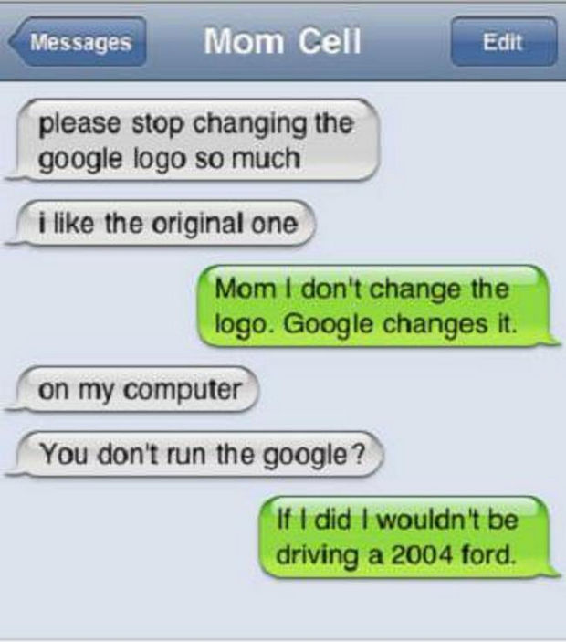 “Please stop changing the Google logo so much. I like the original one. Mom, I don’t change the logo. Google changes it. On my computer. You don’t run the Google? If I did I wouldn’t be driving a 2004 Ford.”