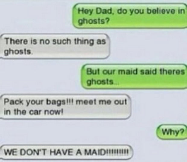 Funny texts from parents: “Hey Dad, do you believe in ghosts? There is no such thing as ghosts. But our maid said there are ghosts. Pack your bags!!! Meet me out in the car now! Why? WE DON”T HAVE A MAID!!!”